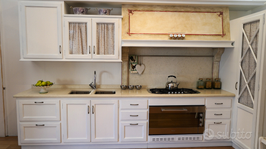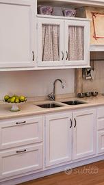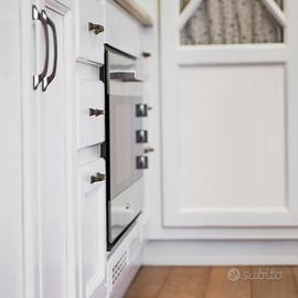 Giglio è una cucina dallo stile provenzale in noce laccato bianco, con struttura a telaio e top in marmo biancone. La cucina comprende un lavello Foster due vasche in acciaio inox con installazione sotto-top, miscelatore Teka, un piano cottura Foster 5 fuochi con installazione filo-top e un forno incassato Smeg di 90 cm. Troviamo poi una dispensa ad angolo con un’anta con lavorazione ad inglesina.
