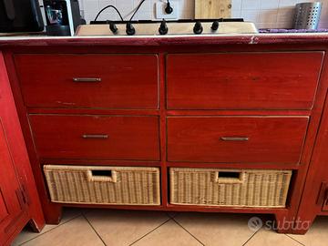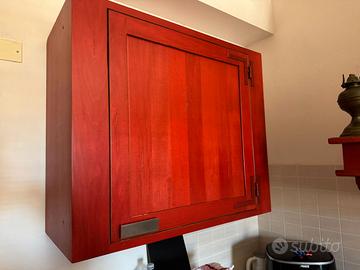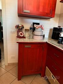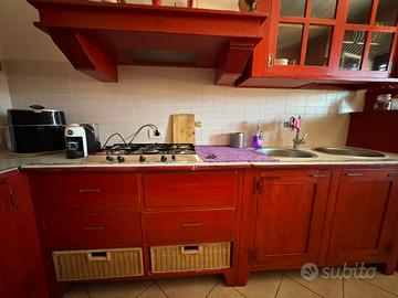 Vendesi bellissima cucina completa in legno massello, caratterizzata da un caldo color rosso tipico dello stile country/provenzale. La cucina è molto robusta, curata nei dettagli e ideale per chi cerca un arredamento di carattere, perfetto per una casa di campagna, una taverna o per amanti dello stile Shabby Chic.La cucina include: Zona Cottura & Lavaggio: Piano cottura a gas con 4 fuochi, lavello a doppia vasca circolare in acciaio inox e cappa a camino coordinata. Elettrodomestici: Forno a incasso e frigorifero a libera installazione (opzionale/da concordare). Dettagli di pregio: Pensili con ante a vetro, vani a giorno, cassetti spaziosi e caratteristici cestini in vimini estraibili. Credenza coordinata: Ampia vetrina con illuminazione interna (perfetta per esporre servizi di piatti e bicchieri).: La cucina è usata ma ben mantenuta. La struttura in vero legno permette eventuali personalizzazioni o riverniciature (decapatura).