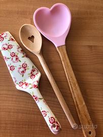 Vendo tris di utensili da cucina: paletta dolci in ceramica, cucchiaio a cuore legno e silicone, cucchiaio con cuore in legno.