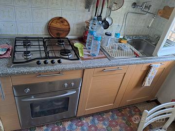 Cucina lineare con forno, lavandino, lavastoviglie, pensili, un tavolo e 4 sedie.