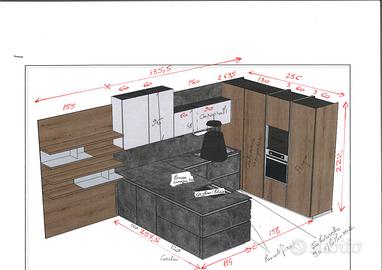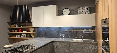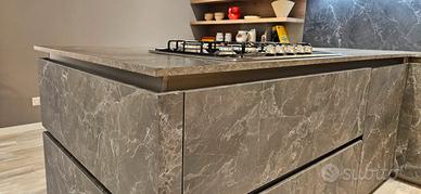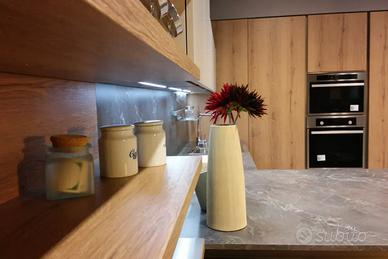 Disponibile per rinnovo esposizione cucina completa con penisola, parete colonne e lato living, cm 491x257.5(penisola)/255.5(colonne). Zoccolo ribassato, gole metalliche. Finitura rovere cuoio, pietra grigia e fango. Completa di frigo incasso XL, forno, micro h 45, piano cottura a gas (da valutare eventuale sostituzione con induzione), cappa, lavello Neptune Plus Franke, miscelatore. Predisposta per inserimento lavastoviglie. Prezzo originale euro 18.000 scontato del 55 %. Trasporto e montaggio esclusi. IVA inclusa.
