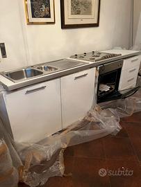 Cucina nuova amcora imballata, piano cottura a gas, forno elettrico, colonna frigo con ampio congelatore, lunghezza totale 3 metri, colore bianco.