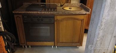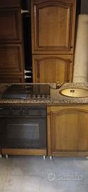 cucina in legno massello color noce con ripiani in marmo granito, moduli: piano cottura forno e lavello in ceramica cm.140x60 - frigorifero cm.60x60xH 200-base 4 sportelli cm.180x60 con ripiano in marmo cm.220x80xH3- scolapiatti cm.60x35. Gli elettrodomestici sono da controllare o sostituire,