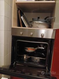 Cucina moderna con base rossa e pensili grigi. - Base con finitura lucida. - Pensili con maniglie in metallo. -Lavastoviglie Misure: forno altezza 215 larghezza119. Fornelli sotto e' sopra 240 e altezza 88 basso cappa 71
