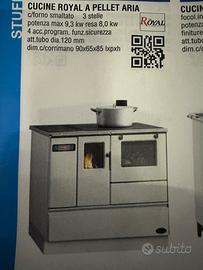 Cucina a PELLET ROYAL PALAZZETTI con forno smaltato, piastra cottura, ventilata potenza 9,3 Kw resa 8 Kw. Dimensioni con corrimano cm L90xp65 h85 COLORE BIANCO € 2650,00 COLORE NERO € 2850,00