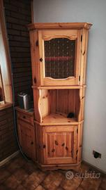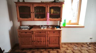 vendo in blocco cucina rustica con forno, gas e cappa aspirante + grande credenza + mobiletto + mobile angolare + pensile angolare. Possibilità di avere anche frigorifero con supplemento di prezzo. Tutto in condizioni eccellenti, è mobilia in vero legno, degli anni '90, sfruttata pochissimo. La cucina è componibile, attualmente è posizionata ad angolo. Il pezzo frontale ha profondità 60, larghezza lato lungo 180, con l'aggiunta sul lato corto di ulteriori 60 cm utilizzati dal piano cottura + altri 60 per il mobile del frigo (anche questo posizionabile a piacere). L'altezza del piano della cucina è 85. La stessa è dotata anche di pensili adibiti a sgocciolatoio e credenza angolare sopra il piano di lavoro. La credenza è 3 ante, è larga 180 e alta 190. All'interno è dotata di ripiani. Il pensile angolare, il mobile angolare e il mobiletto sono da 40. Smontaggio a carico del compratore (con possibilità di assistenza e supporto da parte del venditore). Trasporto a carico del compratore