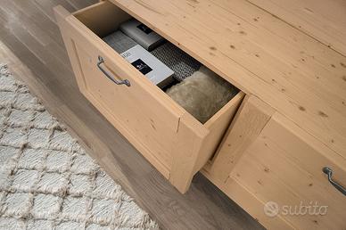 Materiali di Alta Qualità: La struttura in laminato assicura resistenza e facilità di pulizia, mentre le ante in massello di abete aggiungono un tocco di autenticità.