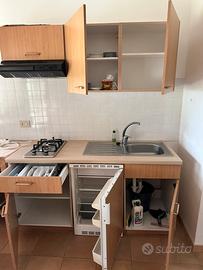 Vendesi cucina color legno munita di fornello a due fuochi, cappa e frigo a incasso. Lunghezza 160 cm. Smontaggio e trasporto a carico dell’acquirente. Ideale per piccoli appartamenti, taverne e B&B. 330 euro trattabili.
