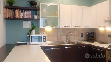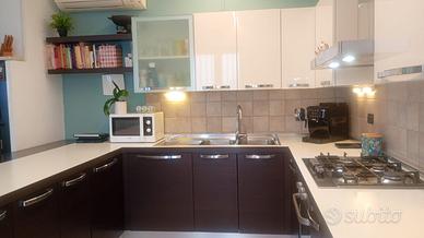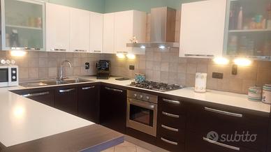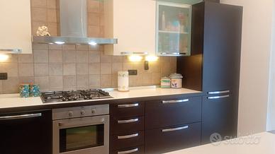 Cucina completa in eccellenti condizioni – Veneta Cucine stile moderno (bianca e wengé)-. La cucina è composta da mobili alti e bassi con ampio spazio contenitivo, cestelli angolari estraibili e cestello porta oggetti e bottiglie estraibile, ampio piano di lavoro, penisola e due mensole in wenge . Inclusi nella vendita: •forno da incasso •piano cottura a gas 5 fuochi Bosh•cappa aspirante •lavastoviglie Candy •frigorifero con congelatore da incasso Electrolux •lavello doppia vasca e sgocciolatoio con miscelatore •illuminazione sotto i pensili •accessori e ferramenta originali. La cucina è perfettamente funzionante, ben tenuta e pronta all’uso. Prezzo richiesto: € 2.300. Ritiro e smontaggio a carico dell’acquirente. Misure: Penisola: 204x90,5 Lato lavello: 298x61 Lato piano cottura/frigo: 379x61 (+ 12,5 di tamponamento) Ulteriori foto disponibili su richiesta