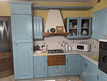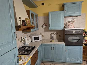 Vendo cucina Scavolini con disposizione ad angolo, misure 270 cm per 210 cm e altezza 245 cm. La cucina è in legno azzurro polvere con venature a vista. La struttura è molto solida e sia i pensili che i cassetti hanno cerniere perfettamente funzionanti. La cucina viene ceduta completa di forno Smeg, frigorifero a colonna e cappa coordinata. Il piano cottura a 5 fuochi è stato sostituito di recente e il microonde è nuovo. NO LAVASTOVIGLIE. Sono inclusi anche il lavello e il miscelatore coordinati in tinta, oltre al tavolo rettangolare con le 4 sedie abbinate. La cucina si presenta con normali segni di usura dati dall'età e una piccola bruciatura sul piano di lavoro vicino ai fornelli. Per il resto la cucina è pronta all'uso e non necessita di interventi. Smontaggio e trasporto a carico di chi acquista. La cucina si trova a Tribano (PD) ed è disponibile per essere vista di persona.