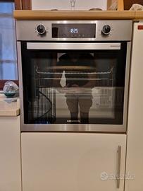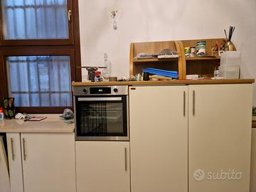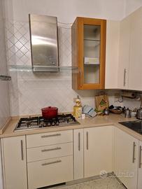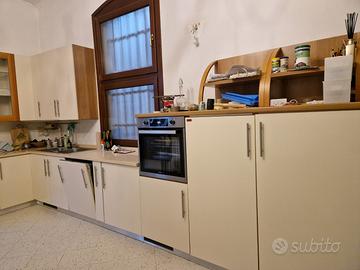 Cucina Scavolini sviluppo complessivo 205 + 225 cm x 60 cm profondità x h 85 cm + nr 3 moduli sviluppo 180 cm x h 135 cm, tutto in laccato bianco panna con parti in essenza legno a vista. Cucina datata ma in buone condizioni, completa di fuochi da 90 cm e lavello da 90 cm in acciaio. forno Grundig con 2 anni di vita come nuovo