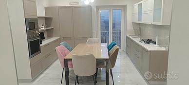Cucina Scavolini modello Carattere laccato opaco bianco Prestige e visone, maniglia satinata, zoccolo h10 alluminio, piano quarzo spessore 3cm completo di schienale. Composta da elettrodomestici: colonna frigo Grunding da 75, lavastoviglie Hotpoint, piano cottura vetro bianco 75 Whirlpool, forno microonde Smeg inox, forno elettrico ventilato inox Smeg, lavello sottotop 2 vasche + rubinetto Gessi. Portaposate, pattumiera, tappetini