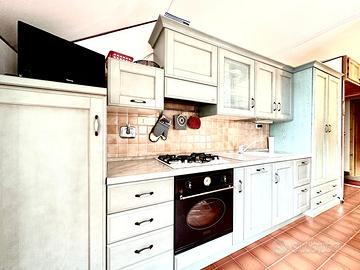 frigo da incasso, forno elettrico, piano cottura con 3 fornelli a gas più una piastra elettrica , lavello una vasca con sgocciolatoio, lavastoviglie da incasso, scolapiatti e mobilio.