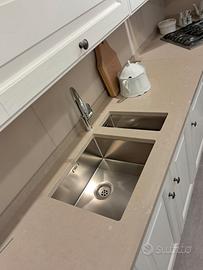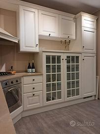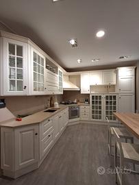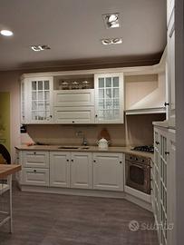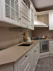 Cucina Scavolini modello Baltimora in legno Rovere Bianco,completa di top in quarzo Beige, con lavello integrato inox come foto. cm 330 lato dx e 355 lato sx. Elettrodomestici compresi: Frigo 60 piano cottura gas inox cappa angolare e Lavello. Esclusi Forno e Lavastoviglie. Cucina nuova visibile montata in Expo. Il prezzo si intende smontata imballata Escluso Trasposto e Montaggio