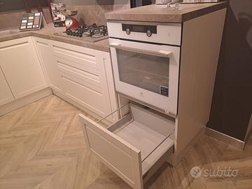 Nella dotazione di elettrodomestici spicca il piano cottura Telma da 75 cm in fragranite color tartufo, abbinato al lavello a due vasche con miscelatore dello stesso materiale e colore. Il forno Electrolux multifunzione ventilato in vetro bianco con funzione vapore offre versatilità per ogni tipo di cottura. Completa l'offerta il frigocongelatore Electrolux con congelatore inferiore a tre cassetti e la cappa Elica a sospensione da 50 cm bianca.