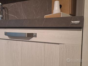 Il top in laminato, spesso 4 cm, è accompagnato da uno schienale abbinato che garantisce continuità estetica e praticità. Le maniglie in alluminio e lo zoccolo in finitura alluminio grigio da 15 cm completano il look contemporaneo della cucina.