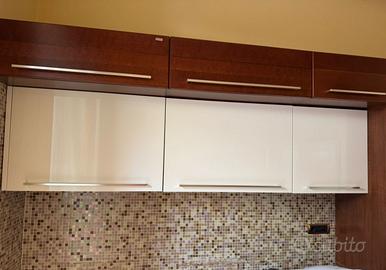 Cucina Scavolini in ciliegio e laccata avorio di 3,60 metri lineari e H 2,02 m in ottime condizioni, composta di pensili laccati e sovrapensili in ciliegio. Comprende piano cottura smeg, lavello smeg,cappa Faber, frigo Whirlpool + tavolo scavolini in ciliegio.