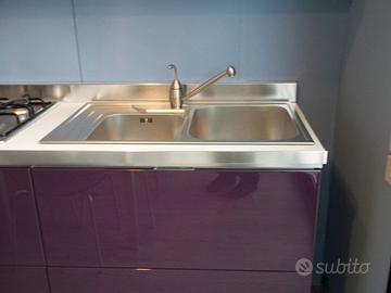 Cuina Scavolini modello MOOD, basi e colonne laccata lucido melanzana, pensili laccati lucido bianco, top in laminato bianco, elettrodomestici in acciaio inox, lavello e piano cottura Franke.