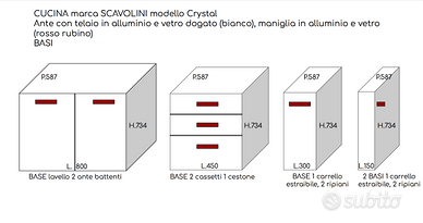 Vendo mobili CUCINA marca SCAVOLINI modello Crystal con Ante con telaio in alluminio e vetro dogato (bianco), maniglia in alluminio e vetro (rosso rubino).