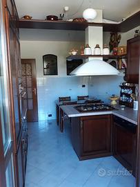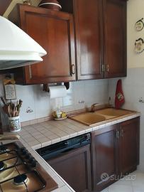 cucina in legno noce chiaro modello "Domebel" con penisola piastrellata molto spaziosa per pentole . completa di elettrodomestici , Lavastoviglie, frigo/freezer , forno elettrico.