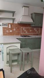 vendo cucina componibile con penisola realizzata con struttura in legno multistrato marin . Frontali mensole e trave della cappa in legno massello finitura decapato, completa di piano cottura e. Frigo ( forno e lavastoviglie non sono in vendita)