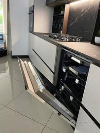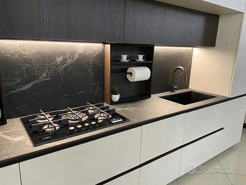Cucina modello ‘Joy ’ firmata Snaidero cucine. Joy è una cucina dallo stile moderno, caratterizzata da un profilo in alluminio integrato sull’anta divenendo un segno altamente distintivo. La composizione in oggetto è lineare, caratterizzata da pensili sopra-armadi con la profondità di 64 cm, disposti a ponte, che permettono di ottimizzare lo spazio al meglio. Al di sotto di questi ultimi abbiamo i particolari pensili ad ‘anta unica’, dove in un’unica anta dalle dimensioni rispettive di 150cm ciascuna, troviamo più moduli insieme, prediligendo in questo modo la pulizia delle linee. La composizione inoltre è arricchita da moduli a giorno definiti “E-Wall” accessoriati da un lato con un porta rotolo + porta mestoli e dall’altro da un modulo porta calici. Le finiture materiche utilizzate sono il Resina Cenere, abbinata al calore della finitura Rovere Lido. Il top è in ceramica ‘Marmo Nero Rigato, dallo spessore di 1,2cm , avente lo schienale coordinato. Completa di elettrodomestici a marchio Whirlpool, quali: Piano cottura in vetro da 75cm , forno multifunzione in vetro nero, Lavastoviglie 13 coperti , Frigo combinato . Il lavello è in fragranite marchiato Franke, con installazione sotto top.