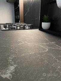 Cucina modello ‘Joy ’ firmata Snaidero cucine. Joy è una cucina dallo stile moderno, caratterizzata da un profilo in alluminio integrato sull’anta divenendo un segno altamente distintivo. La composizione in oggetto è lineare, caratterizzata da pensili sopra-armadi con la profondità di 64 cm, disposti a ponte, che permettono di ottimizzare lo spazio al meglio. Al di sotto di questi ultimi abbiamo i particolari pensili ad ‘anta unica’, dove in un’unica anta dalle dimensioni rispettive di 150cm ciascuna, troviamo più moduli insieme, prediligendo in questo modo la pulizia delle linee. La composizione inoltre è arricchita da moduli a giorno definiti “E-Wall” accessoriati da un lato con un porta rotolo + porta mestoli e dall’altro da un modulo porta calici. Le finiture materiche utilizzate sono il Resina Cenere, abbinata al calore della finitura Rovere Lido. Il top è in ceramica ‘Marmo Nero Rigato, dallo spessore di 1,2cm , avente lo schienale coordinato. Completa di elettrodomestici a marchio Whirlpool, quali: Piano cottura in vetro da 75cm , forno multifunzione in vetro nero, Lavastoviglie 13 coperti , Frigo combinato . Il lavello è in fragranite marchiato Franke, con installazione sotto top.