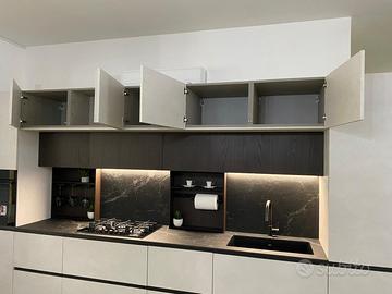Cucina modello ‘Joy ’ firmata Snaidero cucine. Joy è una cucina dallo stile moderno, caratterizzata da un profilo in alluminio integrato sull’anta divenendo un segno altamente distintivo. La composizione in oggetto è lineare, caratterizzata da pensili sopra-armadi con la profondità di 64 cm, disposti a ponte, che permettono di ottimizzare lo spazio al meglio. Al di sotto di questi ultimi abbiamo i particolari pensili ad ‘anta unica’, dove in un’unica anta dalle dimensioni rispettive di 150cm ciascuna, troviamo più moduli insieme, prediligendo in questo modo la pulizia delle linee. La composizione inoltre è arricchita da moduli a giorno definiti “E-Wall” accessoriati da un lato con un porta rotolo + porta mestoli e dall’altro da un modulo porta calici. Le finiture materiche utilizzate sono il Resina Cenere, abbinata al calore della finitura Rovere Lido. Il top è in ceramica ‘Marmo Nero Rigato, dallo spessore di 1,2cm , avente lo schienale coordinato. Completa di elettrodomestici a marchio Whirlpool, quali: Piano cottura in vetro da 75cm , forno multifunzione in vetro nero, Lavastoviglie 13 coperti , Frigo combinato . Il lavello è in fragranite marchiato Franke, con installazione sotto top.