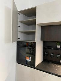 Cucina modello ‘Joy ’ firmata Snaidero cucine. Joy è una cucina dallo stile moderno, caratterizzata da un profilo in alluminio integrato sull’anta divenendo un segno altamente distintivo. La composizione in oggetto è lineare, caratterizzata da pensili sopra-armadi con la profondità di 64 cm, disposti a ponte, che permettono di ottimizzare lo spazio al meglio. Al di sotto di questi ultimi abbiamo i particolari pensili ad ‘anta unica’, dove in un’unica anta dalle dimensioni rispettive di 150cm ciascuna, troviamo più moduli insieme, prediligendo in questo modo la pulizia delle linee. La composizione inoltre è arricchita da moduli a giorno definiti “E-Wall” accessoriati da un lato con un porta rotolo + porta mestoli e dall’altro da un modulo porta calici. Le finiture materiche utilizzate sono il Resina Cenere, abbinata al calore della finitura Rovere Lido. Il top è in ceramica ‘Marmo Nero Rigato, dallo spessore di 1,2cm , avente lo schienale coordinato. Completa di elettrodomestici a marchio Whirlpool, quali: Piano cottura in vetro da 75cm , forno multifunzione in vetro nero, Lavastoviglie 13 coperti , Frigo combinato . Il lavello è in fragranite marchiato Franke, con installazione sotto top.