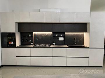 Cucina modello ‘Joy ’ firmata Snaidero cucine. Joy è una cucina dallo stile moderno, caratterizzata da un profilo in alluminio integrato sull’anta divenendo un segno altamente distintivo. La composizione in oggetto è lineare, caratterizzata da pensili sopra-armadi con la profondità di 64 cm, disposti a ponte, che permettono di ottimizzare lo spazio al meglio. Al di sotto di questi ultimi abbiamo i particolari pensili ad ‘anta unica’, dove in un’unica anta dalle dimensioni rispettive di 150cm ciascuna, troviamo più moduli insieme, prediligendo in questo modo la pulizia delle linee. La composizione inoltre è arricchita da moduli a giorno definiti “E-Wall” accessoriati da un lato con un porta rotolo + porta mestoli e dall’altro da un modulo porta calici. Le finiture materiche utilizzate sono il Resina Cenere, abbinata al calore della finitura Rovere Lido. Il top è in ceramica ‘Marmo Nero Rigato, dallo spessore di 1,2cm , avente lo schienale coordinato. Completa di elettrodomestici a marchio Whirlpool, quali: Piano cottura in vetro da 75cm , forno multifunzione in vetro nero, Lavastoviglie 13 coperti , Frigo combinato . Il lavello è in fragranite marchiato Franke, con installazione sotto top.