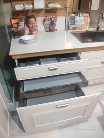Cucina completa di elettrodomestici, tavolo e sedie, lunga 368cm più colonna frigo e forno (120cm) e con basi cassetto e cestone profonde 80cm. si vende a €9.000,00 inclusivi di trasporto e montaggio, con il 70% di sconto dai €30.070,00 di listino.