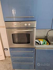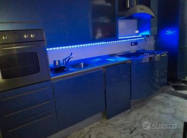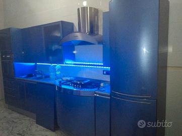 bellissima cucina componibile Snaidero modello Ola desing Pininfarina colore azzurro metallizzato . la cucina è compresa di elettrodomestici come forno Rex ,cappa , piano cottura e lavello con rubinetto e scola piatti . oltre ai vari stipiti ha anche una cassettiera molto comoda per riporre sia le posate che vari strofinacci ed utensili per la cucina e sotto al piano cottura c è un comodo vano per riporre le pentole con un ulteriore mensola per i coperchi ,inoltre ha anche un vano per la lavastoviglie dove attualmente è un porta bombola dato che la cucina è alimentata a gas inoltre il vano frigo incassato l ho trasformato in uno stipite con le varie mensole molto comodo per mettere altri utensili . La cucina ,essendo usata ha qualche difetto non visibile tipo qualche scollatura di fascette in alcuni stipiti ma ciò non compromette la funzionalità del resto è molto bella e funzionale si può anche scomporre in base alle proprie esigenze, vendo per ristrutturazione e cambio arredamento ideale per seconde case o b & b o per case a mare dato il suo colore azzurro metallizzato e forma ad onda da cui prende il nome Ola che in spagnolo vuol dire onda . disponibile a qualsiasi visione . prezzo trattabile.