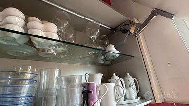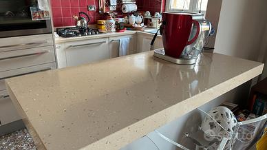 CUCINA SNAIDERO completa di elettrodomestici integrati, laccata lucida color cipria. Top in quarzo in tinta h3 cm con alzatine in quarzo h5 cm. Si sviluppa ad angolo (lato lungo a sin. 306 cm, comprese due fasce di tamponamento laterali di 8 cm e 6 cm; lato corto 205 cm). Profondità 60 cm. Composizione: due moduli a torre h. 212 cm con frigorifero e congelatore WHIRLPOOL; forno ventilato NEFF ad altezza 100 cm da terra; un vano contenitore con ripiano mdf, cassetto con portaposate integrato in legno, due cassetti, cestone. Altri due cestoni sotto il piano cottura WHIRLPOOL (4 fuochi a gas, largh. 60 cm), elemento ad angolo con anta ad avanzamento girevole grazie ad elegante meccanismo interno integrato con ripiani in griglie acciaio inox. Lavello FRANKE acciaio inox unico vascone 86 cm larghezza. Rubinetto FRANKE con miscelatore acciaio inox. Sottolavello con due ante largh 45 cm. Pensile (largh 90 cm e h 53 cm) apertura vasistas con ripiano in cristallo 6 mm). Cappa aspirante FABER integrata, acciaio inox e tre faretti, anta a ribalta. Lavastoviglie REX largh 60 cm. Vano portabottiglie con carrello scorrevole (largh 15 cm), anta laccata e ripiani in griglie acciaio. Zoccolo acciaio satinato h. 15 cm. Maniglie acciaio inox spazzolato. Accessori: due moduli tubo in acciaio inox con ganci portamestoli, due scolapiatti acciaio. Completa la dotazione un ripiano per penisola in quarzo identico al top cucina (120cm-60cm-6cm).