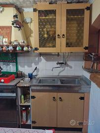 Graziosa cucina in laminato abete chiaro, stile tirolese completa di pensili, dispensa, credenza, acquario doppio in acciaio inox con scolapiatti, fornello con cappa aspirante e tavolo con quattro sedie, cedo causa vendita dell' immobile.