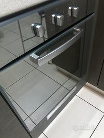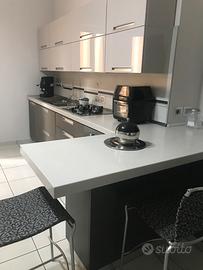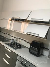 Cucina Stosa con penisola, piano di lavoro in okite alto 5 cm, forno e piano cottura Indesit in vetro temperato, cappa integrata, cestello estraibile in acciaio porta bottiglie, inclusi 2 bellissimi sgabelli Calligaris (valore300€). Misure totali 4.50 metri. Possibilità di dividere in 2 blocchi 3 metri lineari + 1,50