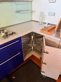 cucina marca STRATO moderna colore grigio e blu lunghezza di sviluppo totale 5,85 m + penisola a goccia. ( se devi considerare il muro disponibile aggiungere 1,20 dallo sviluppo cucina per i due angoli).