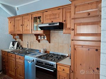 cucina in legno di pino completa di elettrodomestici, frigorifero, piano cottura a gas con rispettiva cappa, forno e lavastoviglie. Lavello in acciaio inox a due vasche. Tavolo con prolunga. Cassapanca angolare e tre sedie. Mobile retro cassapanca a 6 ante. Il tutto in buono stato.