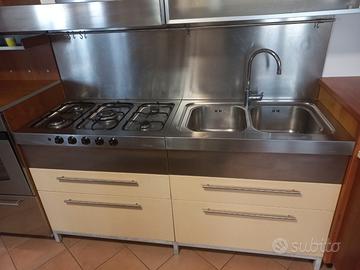 Vendo cucina composta da forno 60 cm, gas 90 cm, lavello 90 cm e banco appoggio laterale destra da 90 cm. (L'isola bianca centrale non è in vendita)