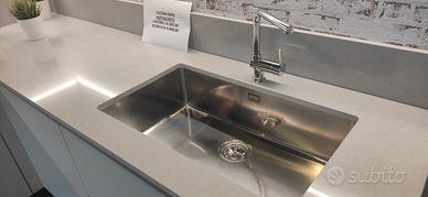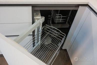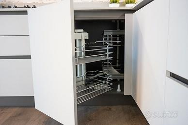 Cucina da esposizione sottocosto ,dimensioni cm 388 x 277 h 264 con possibilità di effettuare modifiche ,basi e colonne laccate grigio opaco e pensili h 72 in laminato Fenix Verde Comodoro , top in quarzo spessore 2 cm , frigorifero da 75 Whirlpool forno multifunzione Whirlpool , microonde Whirlpool , lavastoviglie Whirlpool fa 60 , piano cottura Siemens da 75 ,lavello sottotop inox , meccanismo estraibile in base angolo ed infine barra led