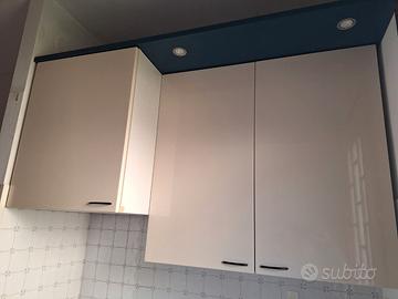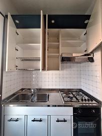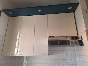 Cucina robusta e ben tenuta, cottura a GPL, forno, cappa aspiante, doppia vasca. Compatta e molto funzionale. Attrezzata con pensili di diverse misure. Mensole sovrapensili complete di faretti.