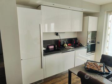 cucina di ottima marca Ernesto Meda laccata bianco lucido, apertura ante e casstti con gola in alluminio, top in quarzo con lavello a 1 vasca e mezza da cm 60 inox sottopiano e piano cottura da cm 60 con 2 zone a irradiazione e 2 zone a induzione + forno elettrico ventilato programmabile e forno a microonde ntegrato + colonna per frigo-freezer e vano per lavastoviglie a scomparsa. La cucina misura cm310 ed é disponibile dal 28/05/2026