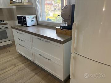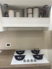 Cucina composta da piano di lavoro 180cmL , H 90cm ; piano lavabo con 2 vasche , 4 fuochi e forno . 4 ante H48 cm L90cm .