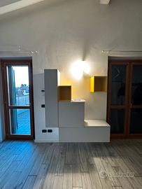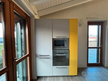 Vendo cucina completa di elettrodomestici (lavabo e miscelatore, frigorifero, forno elettrico e microonde, piano cottura 5 fuochi, lavastoviglie da 12 coperti).Compreso nel prezzo la piccola parete. Colore grigio perla e giallo. Composizione come da foto 5 metri. Smontaggio e trasporto a carico dell'acquirente.