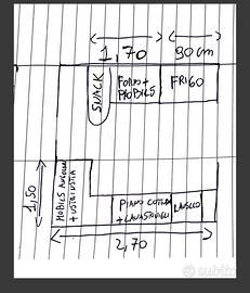 Vendo cucina usata, regalo frigo da ritirare in secondo momento, la cappa è da riparare ,le foto sono state fatte durante lo smontaggio ho fatto un disegno con misure per rendere l idea, lo snak porta pure la parte inferiore con 2 sgabbelli.