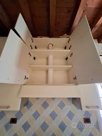Cucina angolare con piano cottura n. 5 fuochi e cappa di aspirazione, senza altri elettrodomestici. Base e pensili color panna opaco, altezza m. 2,81, lunghezza lati esterni m. 2,70 e m. 2,27, lunghezza lati interni m. 2,10 e 1,65. Lavello da sostituire. Smontaggio e trasporto a carico dell'acquirente.