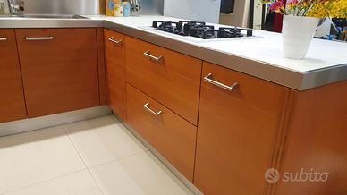 Composta da colonna forno da 60, base vano lavastoviglie ( escluso lavastoviglie), cassettiera da 60 3 cassetti piccoli, 1 grande totalmente estraibili, basi sottolavello da 120, base angolare da 45, n.2 cestoni sotto piano cottura, e 1 base da 45. Gocciolatoio per i piatti da 120 circa in vetro.(Escluso frigo , cappa e lavastoviglie)