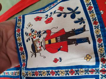 grembiule da cucina in stile tirolese ( Val Gardena ) in cotone, con tre tasche, motivi tipici in bianco, rosso, giallo e blu, adatto a una bambina.