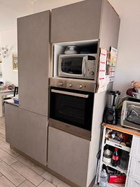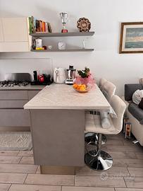 Cucina acquistata da Domus Arredi a Lissone in ottime condizioni in vendita causa trasloco, così composta: mobile basso con lavastoviglie e fornelli L273, P62, H93cm; pensili superiori bianchi L242, P35, H60cm; mensole grigie L120, P33cm; penisola L158, P95, H95 cm; mobile frigorifero L164, P65, H215cm. Nel prezzo sono compresi sgabelli della penisola ed elettrodomestici.