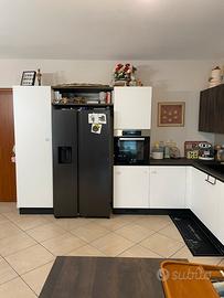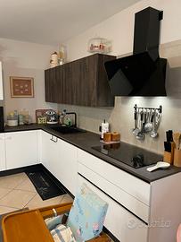 Vendesi cucina moderna Veneta Cucine, acquistata nel 2023, in perfette condizioni, dal design elegante con finiture bianco opaco e legno scuro.