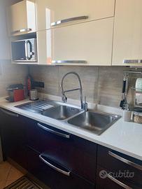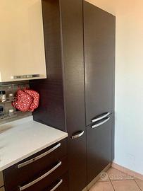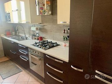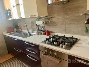 Cucina lineare VENETA CUCINE in ottimo stato, lunghezza cm. 428 x 60 di profondità. Parte inferiore in legno wenge’, parte superiore bianca laccata lucida, piano in granito-quarzo. Comprensiva di frigo, forno, lavastoviglie, piano cottura, cappa acciaio inox, doppio lavandino con gocciolatoio.